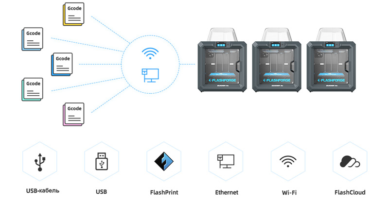 Удобная передача файлов через USB-кабель, флешку, ПО FlashPrint, Ethernet, Wi-Fi или облачную платформу FlashCloud.